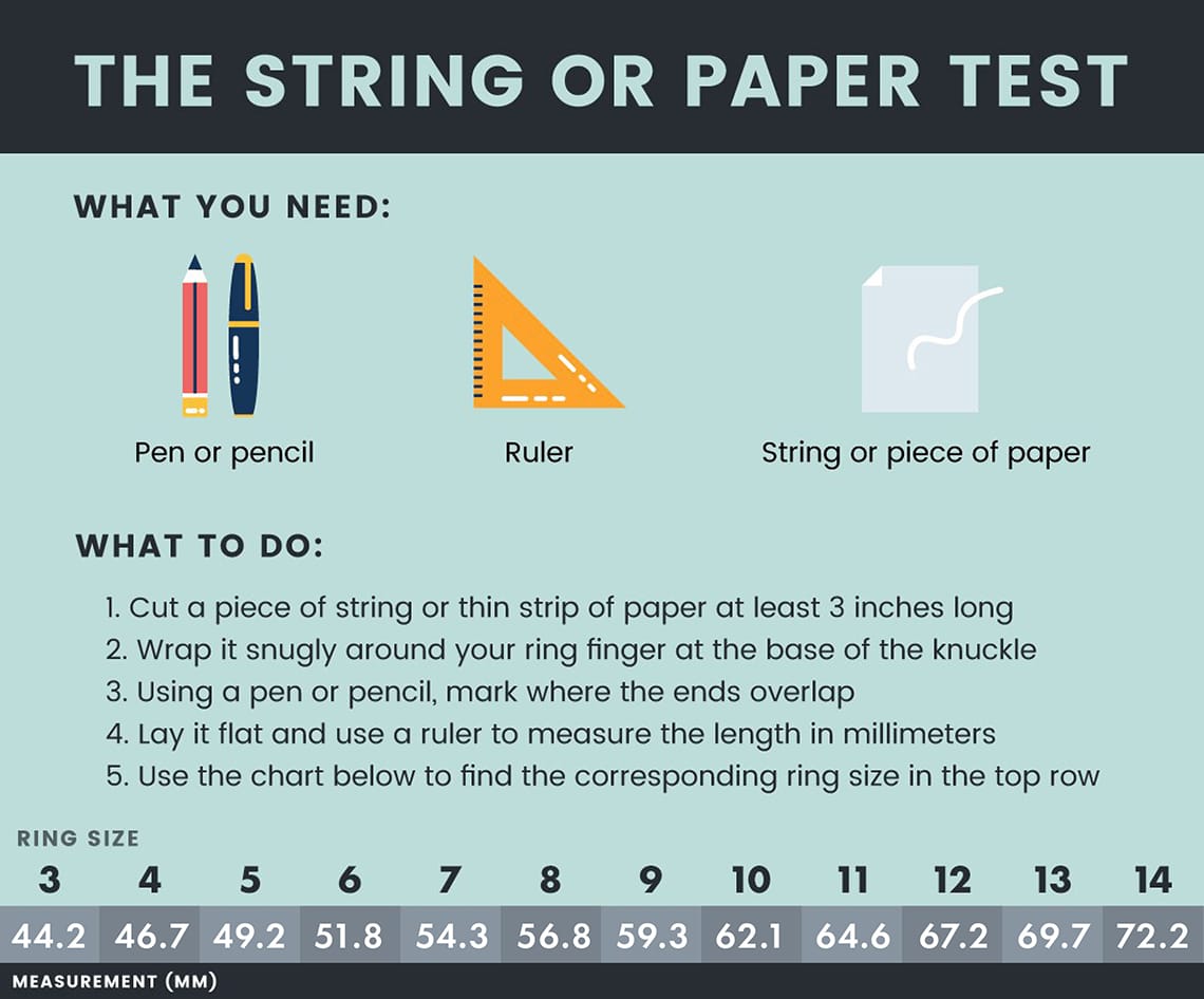 If you do not have access to a printer, you can use either a string or a strip of paper to measure your finger or a ring you already own. See the charts below for further instructions on these sizing methods.